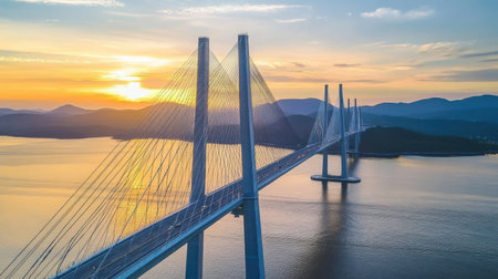 This breathtaking aerial image captures a modern suspension bridge at sunset, showcasing its elegant design and the tranquil beauty of the surrounding landscape.
