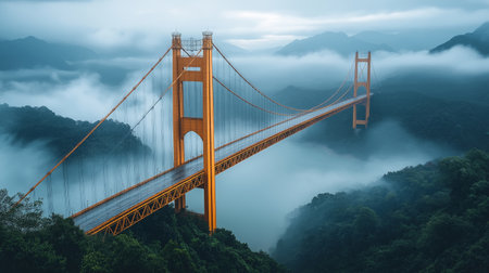 Experience the tranquility of a misty morning as the sun rises over a striking suspension bridge, creating an enchanting atmosphere on the water.