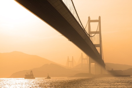 silhouette Tsing Ma double-decked suspension bridge between Ma Wan island and Tsing Yi island in Hong Kong, China at sunset