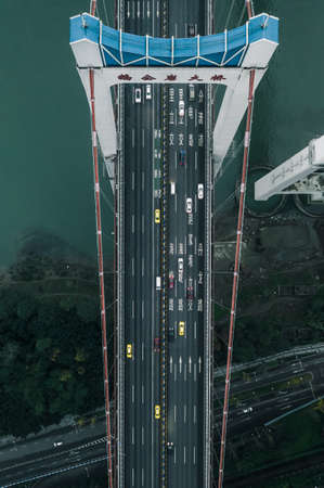 Aerial drone overhead shot of Caiyuanba Changjiang bridge on Yangtze River in Chongqing, southwest China