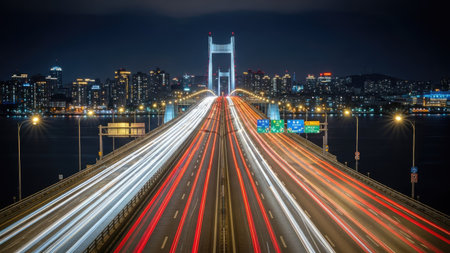 Blue lit suspension bridge at night with vibrant car light trails creating a dynamic urban scene