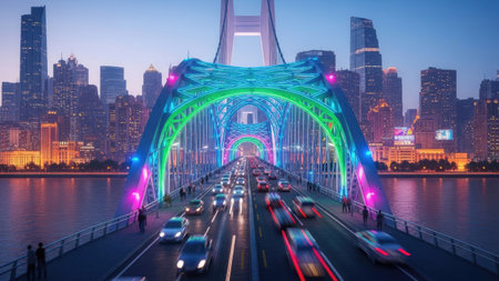 A vibrant bridge spans a waterway, showcasing illuminated colorful arches. Cars traverse the lanes, reflecting the lights of the city skyline in the background. The image presents a contemporary urban scene, bathed in dusk lighting, suitable for various commercial applications.
