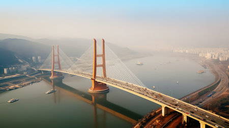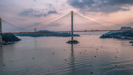 Generative AI : Panoramic aerial view of Stonecutters Bridge crossing the bay near the commercial port of Hong Kong