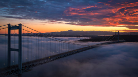 A dramatic suspension bridge stretches across a misty body of water as the sun rises, painting the sky with vibrant colors.