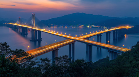 A stunning view of a bridge illuminated at night, arching over tranquil waters. The scene captures the serene beauty of the landscape at twilight.