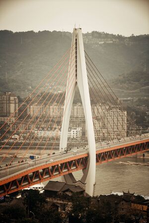 Chongqing, China - Dec 22, 2019: Qian si men suspension bridge over Jialing Rivier in cloudy weather