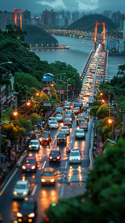 A high-angle view of a road filled with traffic in a city. The road winds down a hillside with lush trees on both sides. In the distance, a bridge stretches across a river leading to a bustling cityscape. The setting sun casts a warm glow on the scene, highlighting the citys lights and the moving cars below.