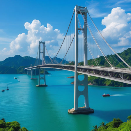 Sunlit Ting Kau Bridge and surrounding scenic views
