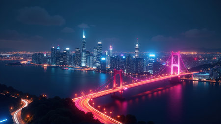 Vibrant Night Cityscape with Illuminated Bridge and Skyline, generative Ai