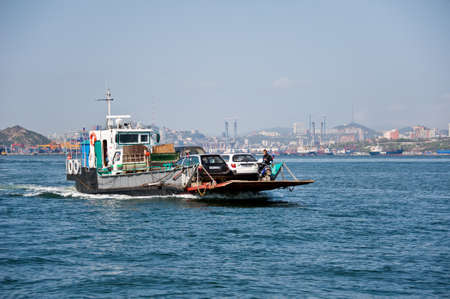 barge`s ferrying cars across as a daily route from Vladivostok to Russian island