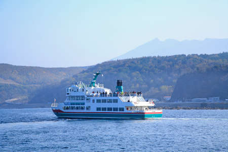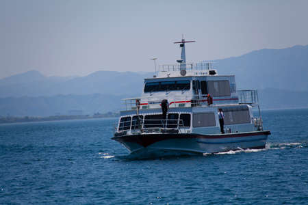 Kerkyra, Corfu, Greece - July 30, 2021: Unrecognized ferry ship with passengers is is sailing on the Ionian sea. A ferry is a vessel used to carry passengers, vehicles and cargo.