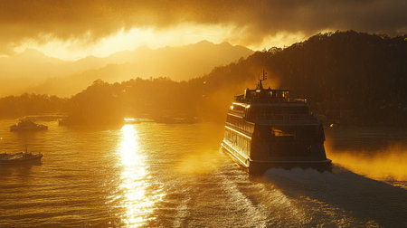 A captivating scene of a ferry moving gracefully through tranquil waters at sunset, surrounded by majestic mountains, creating a breathtaking view filled with serenity and beauty.