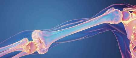 A digital rendering of the upper arm bones, with the humerus and ulna clearly visible, against a blue background. The bones are rendered in a translucent, iridescent style, showcasing the intricate structure and detail of the human skeleton.