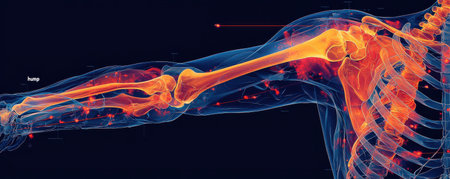 Detailed rendering of the human skeleton arm showing bones and nerve structures