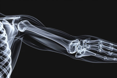 This x-ray image displays the human hand and wrist, revealing the skeletal structure and bones in clear detail, Detailed 3D overview of an X-ray scan of a human bicep, AI Generated