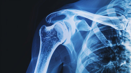 High-Resolution X-Ray Image of a Human Shoulder Joint. Concept of Medical Imaging, Human Anatomy, Diagnostic Tools, Orthopedic Study.