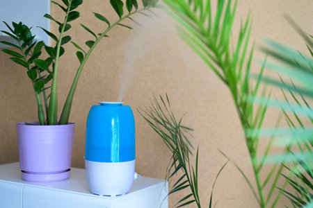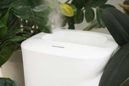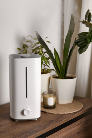 Modern humidifier at home, moistens dry air surrounded by indoor plant. Apartment with moisturizer.