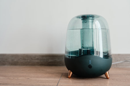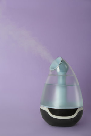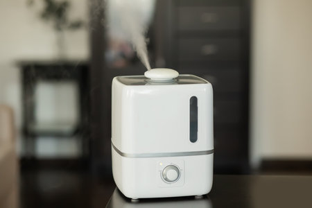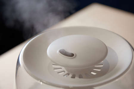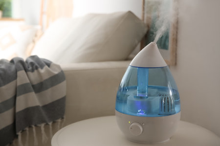 Humidifier releasing mist on a table in a living room at home. Enhancing indoor air quality and creating a healthy.
