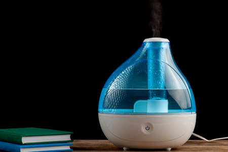 Winter night, cold, flu concepts with an ultrasonic air humidifier creating cool mist water vapor. Stack of books are also seen on wooden tabletop.