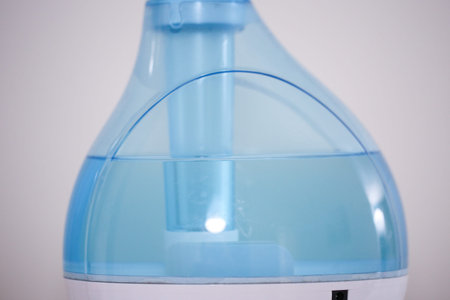 Air humidifier on a bright white background. Blue humidifier in close-up. The concept of taking care of the air, cleansing the air and moisturizing during the winter. - Image