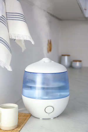 Modern air humidifier, cup and bamboo mat on counter in kitchen