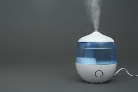 Modern air humidifier on a white wall background. Humidifier spreading steam