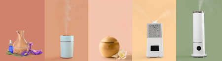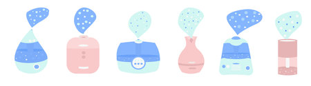 Modern air humidifier, essential oil diffuser collection. Set of cool mist humidifier. Various devices for healthy humidifying the air in the house. Isolated vector illustration in