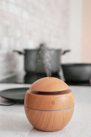 Aroma oil diffuser on the table at home, steam from the air humidifier.