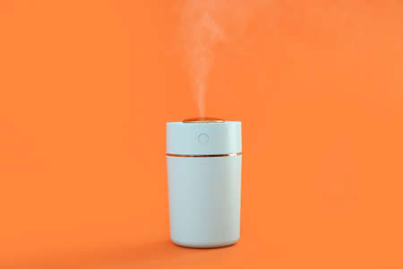 Modern air humidifier on a white wall background. Humidifier spreading steam into the living room