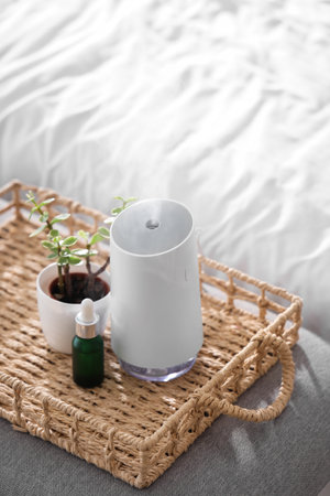 Tray with air humidifier, essential oil and plant on bench in bedroom, closeup