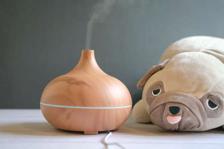 Aroma essential oil diffuser and pug dog soft toy on table. Cosy interior.