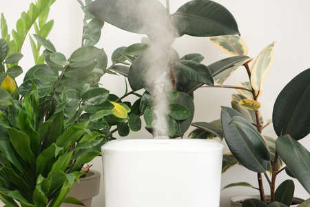 steam from the air humidifier during heating period, surrounded by houseplants. Plant care. Increasing moisture in the apartment.