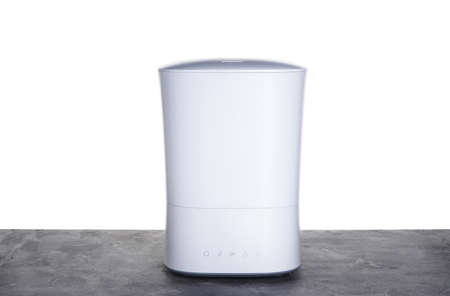Modern white humidifier, aroma oil diffuser at home. Improving the comfort of living in the house, improving indoor humidity. Ultrasonic steam technology.