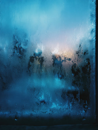 Warm lights shine softly through a fogged window, creating a serene and chilly atmosphere as condensation clings to the glass.