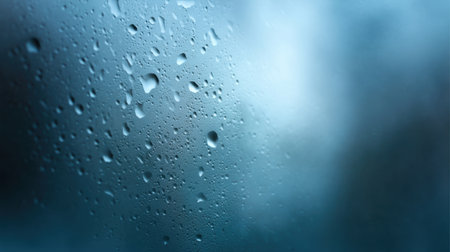 A close-up view of rain drops on a window glass, featuring a beautifully blurred blue background that evokes a calming and serene mood, perfect for various themes.