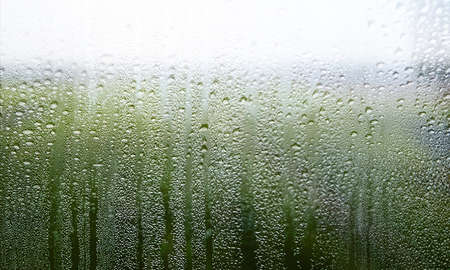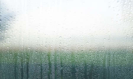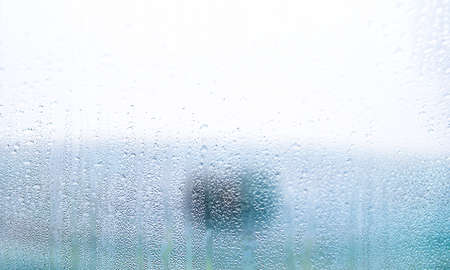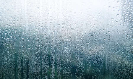 Window glass with high air humidity, large drops drip. Background of natural water condensation