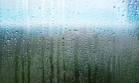 Background with rain drops close up. Rain drops on outdoor window, humid water backdrop, blurred background with copy space for your text
