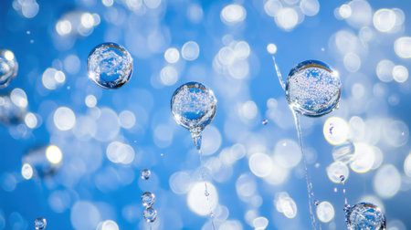 Stunning image of water droplets suspended in midair, showcasing bright blue background and shimmering effects, perfect for themes of nature, freshness, and tranquility.