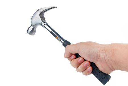 Hand of repairman holding a hammer on a white background