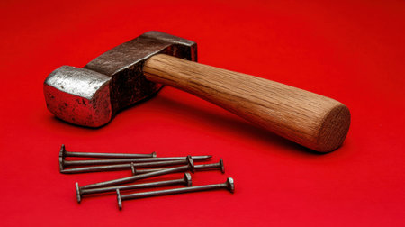 A close-up view of a heavy hammer with a wooden handle alongside several metal nails on a striking red backdrop, perfect for showcasing construction projects.