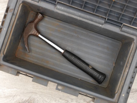 picture of old vintage rusty hammer for carpentry on top of workbench for concept of carpentry in dark texture background