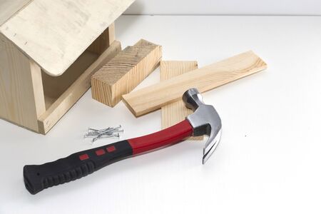 Bird feeder near nails with a hammer, close-up.