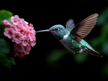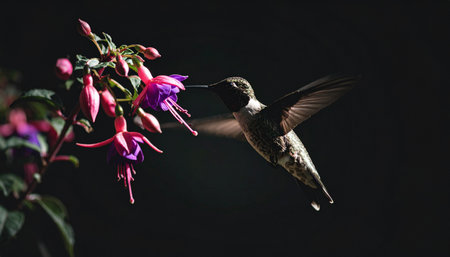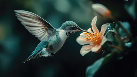 A dynamic and colorful photo of a hummingbird feeding on a flower, captured in a vibrant wildlife photography style. Ideal for commercial use to evoke nature's beauty and energy.