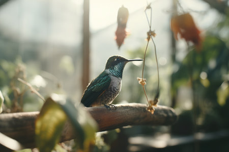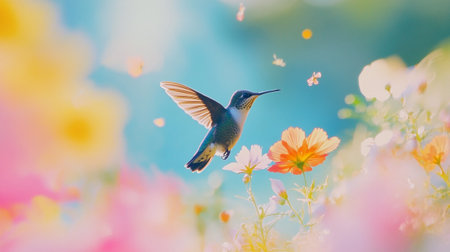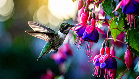 Colorful hummingbird hovering near flowers in a serene garden during early morning light