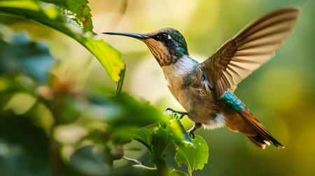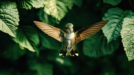 Small hummingbird flitting through the air, gracefully flapping its vibrant wings against a backdrop of lush green vegetation, creating a captivating and serene natural scene
