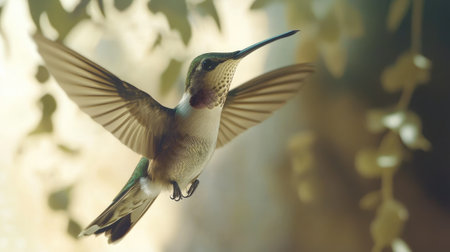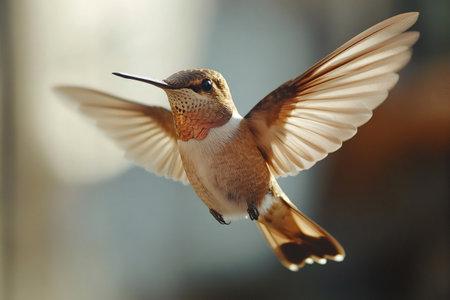This stunning image captures a hummingbird in flight, displaying its vibrant feathers and intricate wing movements against a soft-focus background.