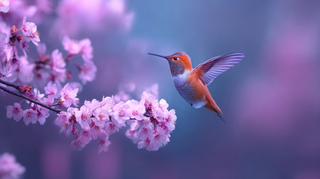 A hummingbird is captured in mid-flight near blossoming branches. Soft pink and purple hues dominate the scene, creating a dreamlike atmosphere. The composition emphasizes natural beauty, highlighting the bird's delicate form and interaction with the floral elements. Suitable for various editorial and commercial applications.