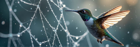 Hummingbird in flight with dew-covered spiderweb in morning light. That the image is generated using AI.