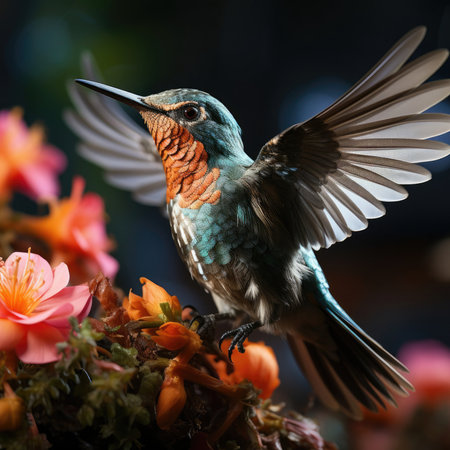 Vibrant hummingbird close up on colorful flower in lush jungle, wildlife in nature concept
