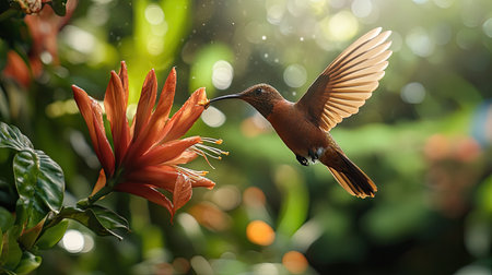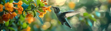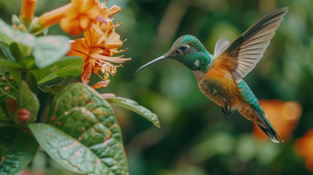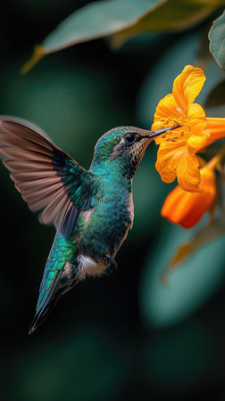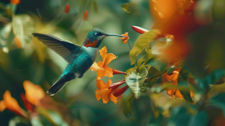 A vibrant hummingbird hovers in mid-air, its wings a blur of motion as it feeds on the nectar of bright orange flowers. The bird's iridescent feathers gleam in the sunlight, while the surrounding foliage creates a backdrop of deep green.